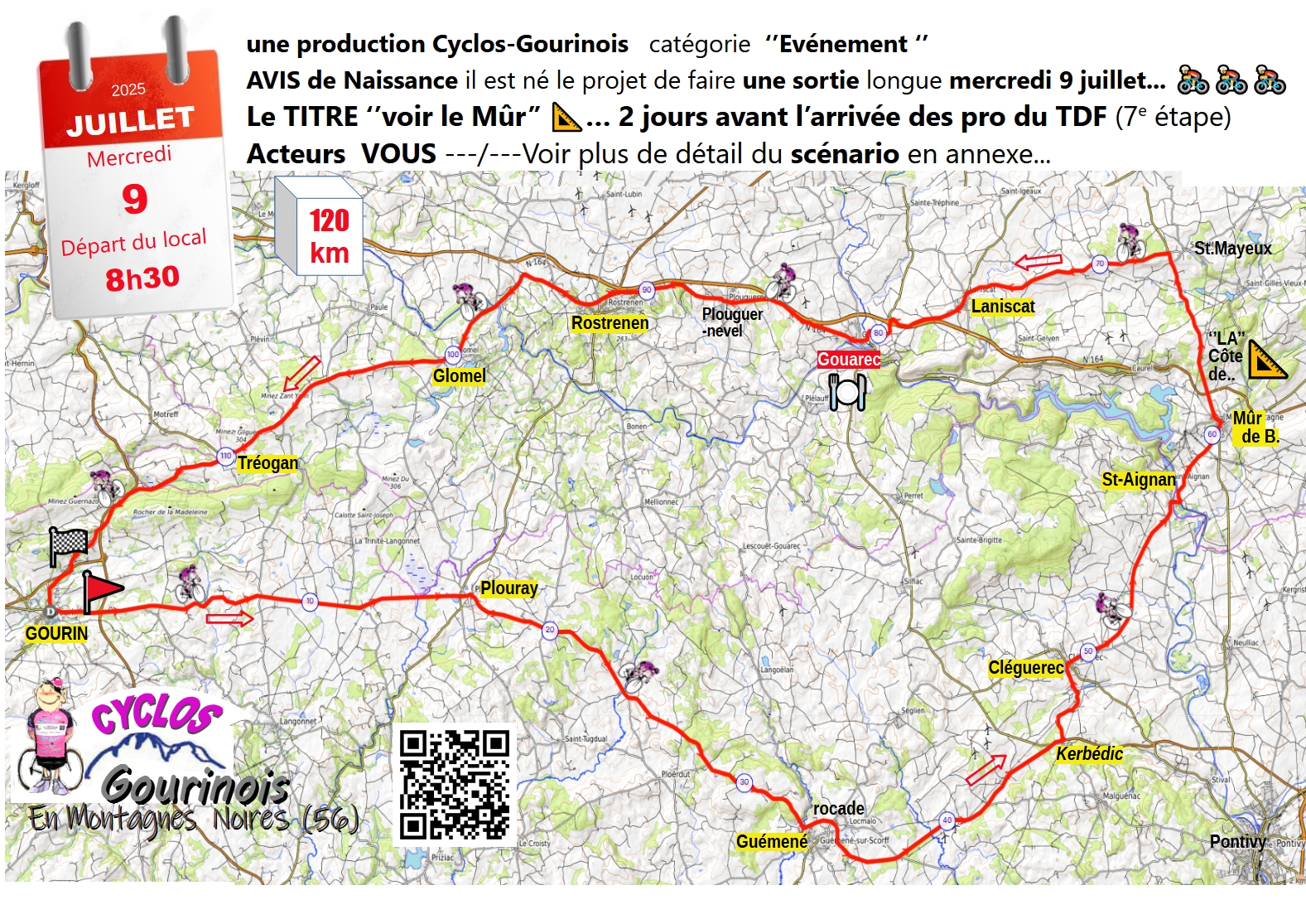 > Gourin > Plouray * > Guémené > Kerbédic > Cléguerec > St-Aignan > Mûr-de-Bretagne (ville) > puis ‘’LE Mûr’’ arrêt pour photos 🚴 reprise parcours > au carrefour D / D à gauche > Laniscat > Gouarec